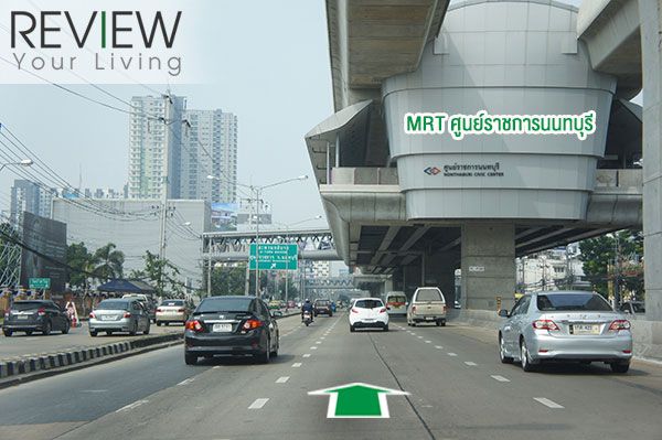 เลยจากแยกแครายมาเราจะเข้าสู่ถนนรัตนาธิเบศร์ จะเริ่มเห็นรถไฟฟ้า MRT สายสีม่วงกันแล้วนะครับ ตรงนี้จะเป็นสถานีศูนย์ราชการนนทบุรี