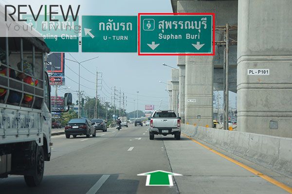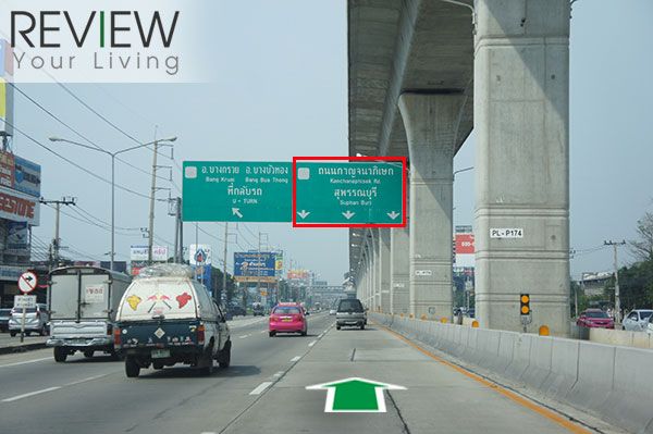 พอใกล้ถึงถนนกาญจนาภิเษกให้เราชิดขวาไปทางสุพรรณบุรี เพื่อขึ้นสะพานวนเข้าสู่ถนนกาญจนาภิเษก