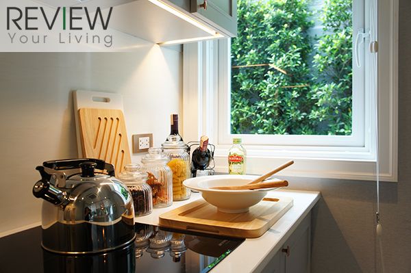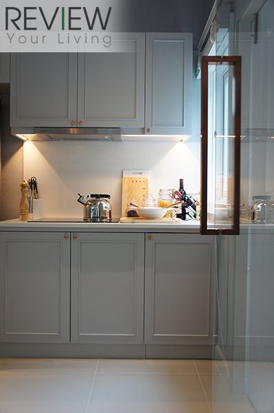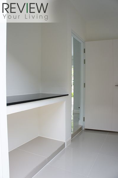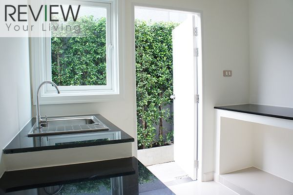 บริเวณห้องครัวโครงการตกแต่งใหม่โดยใช้กระจกใสแทนผนังทึบเหมือนในบ้านแบบมาตรฐาน จึงทำให้โปร่ง