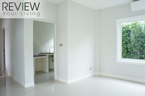 บริเวณครัวตกแต่งใหม่ ใช้กระจกใสบานใหญ่แทนผนังทึบตามแบบบ้านมาตรฐาน ทำให้บรรยากาศในครัวดูโปร่งสบายตากว่าเดิม ซึ่งแน่นอนว่าถ้าอยากได้ครัวสวยแบบนี้บ้างก็ต้องตกแต่งเพิ่มเติมกันไป แต่ถ้าไม่ซีเรียสมากก็จะได้ครัวปิดตามแบบบ้านมาตรฐาน ที่ก็ดูเป็นสัดส่วนเรียบร้อยไปอีกแบบ นอกจากนี้บริเวณชั้นล่างยังมี 1 ห้องนอนเล็ก ที่สามารถดัดแปลงใช้ประโยชน์อื่นๆ ได้ตามต้องการ ไม่ว่าจะเป็นห้องทำงานเหมือนในบ้านตัวอย่าง หรือจะยังคงใช้เป็นห้องนอนสำหรับสมาชิกอาวุโสของบ้านก็ถือว่าสะดวกดีทีเดียว