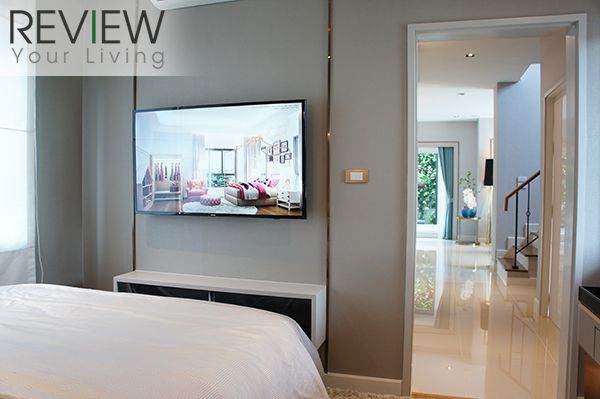 ปลายเตียงยังมีที่เหลือพอให้วางชั้นวางทีวีหรือจะใช้ทีวีแบบแขวนผนัง ก็จะได้พื้นที่เพิ่มขึ้นอีก