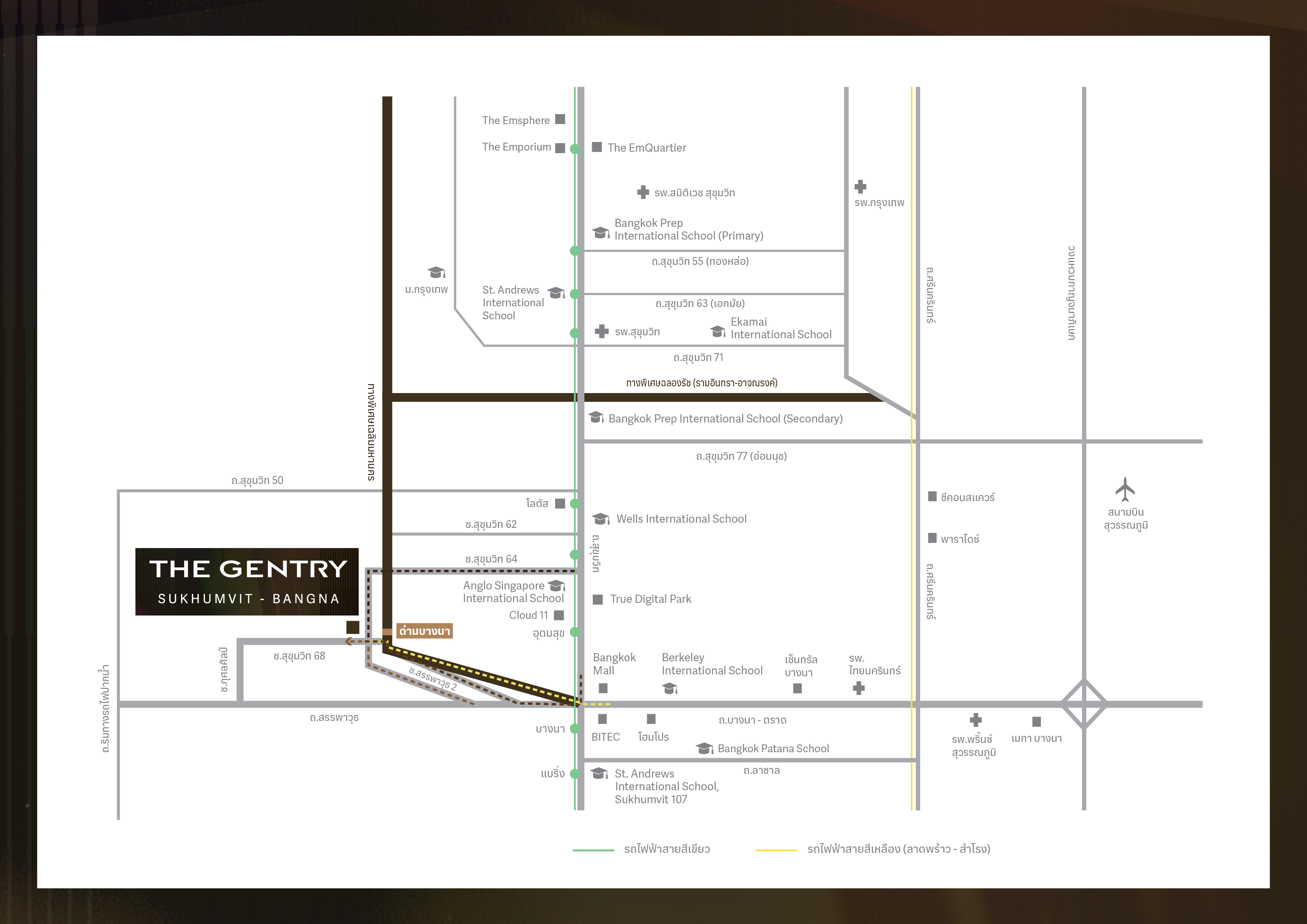 The Gentry สุขุมวิท-บางนา ตั้งอยู่บนทำเลสุขุมวิท-บางนาอย่างแท้จริง เพราะใกล้กับสี่แยกบางนาแบบสุดๆ ตัวโครงการตั้งอยู่ในซอยสุขุมวิท 68 ใกล้ทางด่วนเฉลิมมหานคร (ด่านบางนา) เพียง 250 เมตรเท่านั้น แถมยังมีเส้นทางเข้าออกโครงการได้หลากหลายเส้นทาง เช่น ทางซอยสุขุมวิท 68,ซอยสุขุมวิท 64, ถนนบางนา-ตราด และถนนสรรพาวุธ ตอบโจทย์การเดินทางของคนติดเมืองแบบสุดๆ เพราะแค่อึดใจก็สามารถเข้าถึงใจกลาง CBD ได้อย่างรวดเร็วแล้ว หรือถ้าวันไหนไม่อยากขับรถ ก็สามารถใช้บริการรถไฟฟ้า BTS ได้ง่ายๆ ด้วยทำเลที่อยู่ใกล้สถานีรถไฟฟ้ามากถึง 2 สถานี ใช้เวลาแค่ 5 นาที ก็เลือกได้เลยว่าจะไปที่สถานีอุดมสุข หรือสถานีบางนาก็ได้เช่นกัน