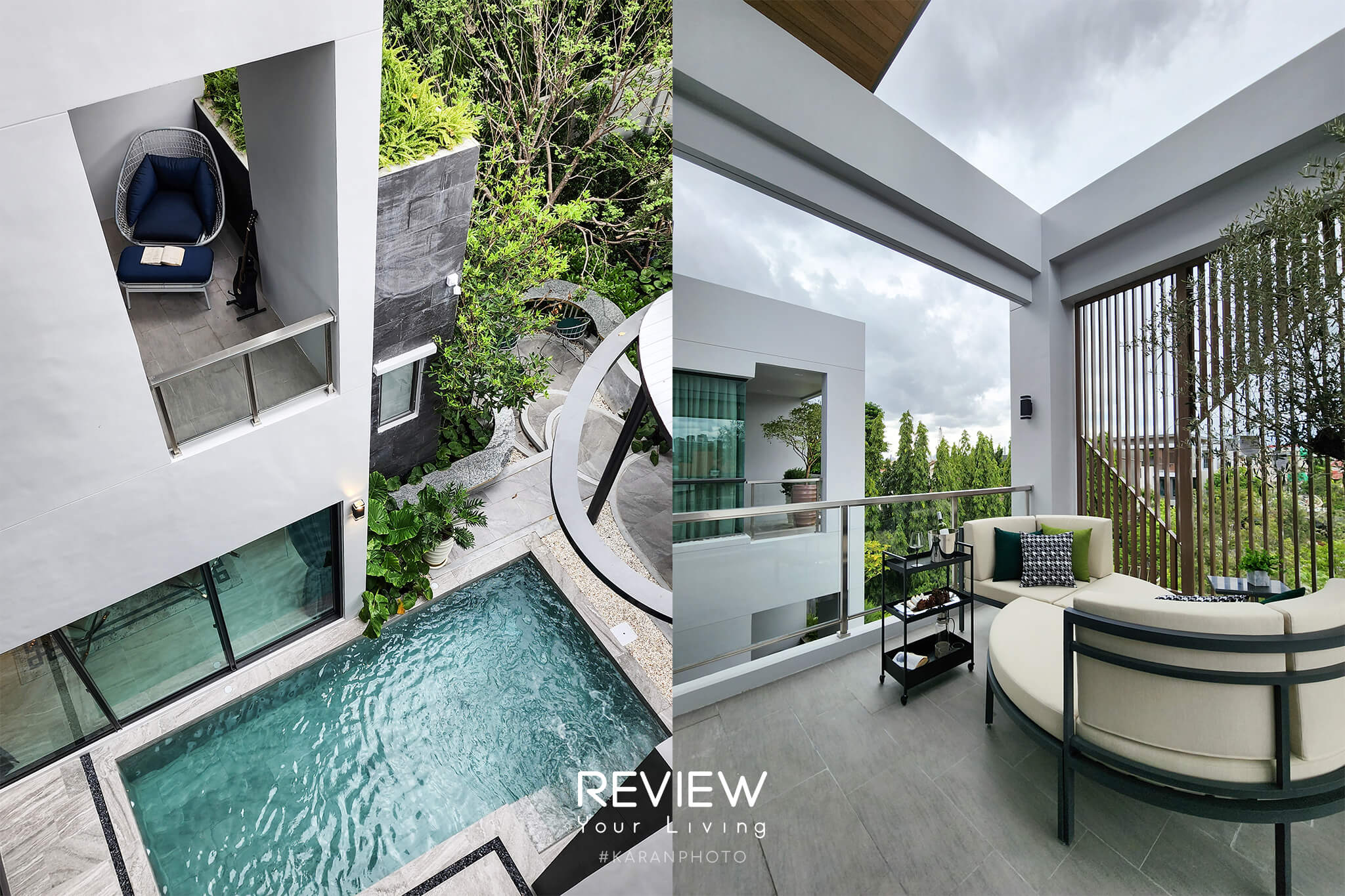 สระว่ายน้ำส่วนตัวภายในบ้าน ให้บรรยากาศของความผ่อนคลายมากที่สุด เพราะแวดล้อมไปด้วยพื้นที่สีเขึยวซึ่งเป็นสวนที่พร้อมจะปรับเปลี่ยนเป็นพื้นที่สังสรรค์ได้อย่างลงตัว