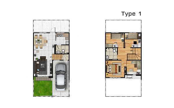 - Type 1 หน้ากว้าง 5.7 เมตร พื้นที่ใช้สอยประมาณ 95 ตารางเมตร ขนาดที่ดิน 17 ตารางวา 3 ห้องนอน 2 ห้องน้ำ 1 ที่จอดรถ