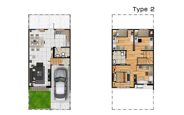 - Type 2 หน้ากว้าง 5.7 เมตร พื้นที่ใช้สอยประมาณ 110 ตารางเมตร ขนาดที่ดิน 18 ตารางวา 3 ห้องนอน 2 ห้องน้ำ 1 ที่จอดรถ