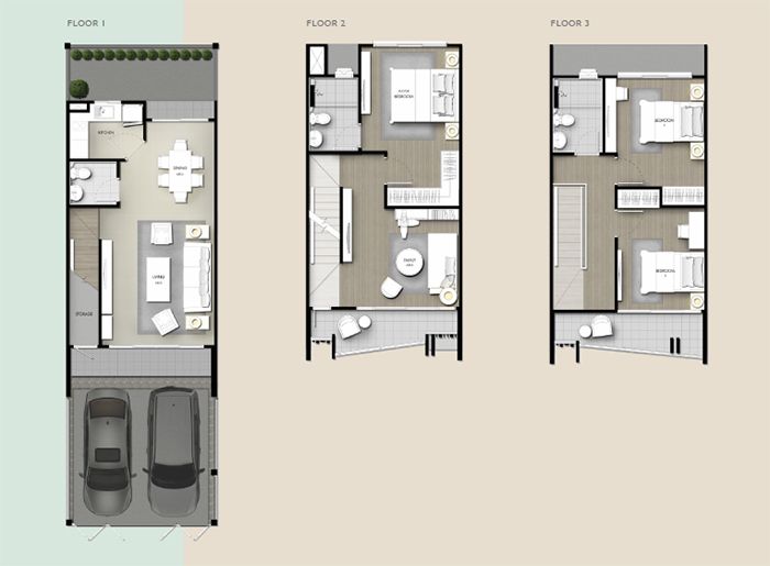 - ดีไซน์ทาวน์โฮม 3 ชั้น หน้ากว้าง 5 เมตร พื้นที่ใช้สอย 168 ตารางเมตร 3 ห้องนอน 3 ห้องน้ำ 2 ที่จอดรถ
