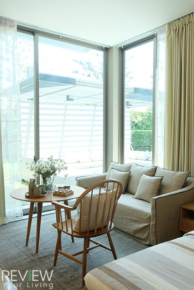 มุมนั่งเล่นข้างเตียงสามารถจัดวางชุดเก้าอี้และโซฟาตัวยาวได้สบายๆ ติดกันนั้นเป็นเป็นประตูบานเลื่อนออกไปยังสวนข้างนอกได้ การมีประตูกระจกทำให้มีแสงจากธรรมชาติเข้ามาภายในห้องได้ดี