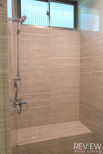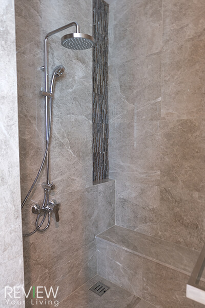 พื้นที่ส่วนเปียก ภายในห้องอาบน้ำ จะกั้นกระจกเทมเปอร์มาให้เรียบร้อยแล้วนะคะ ภายในมีที่นั่งอาบน้ำกรุหินอ่อนมาให้ใช้วางของและนั่งขัดผิวเวลาอาบน้ำได้ โดยจะมีฝักบัวแบบ Rain Shower ติดตั้งมาให้ในตัวแล้วค่ะ