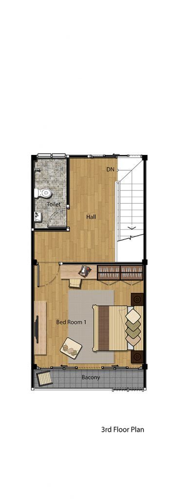 พื้นที่บนชั้น 3 ตามแปลนโครงการตกแต่งเป็นห้องนอน อยู่ติดกับระเบียงขนาดใหญ่ ให้ความรู้สึกเหมือนห้อง Penthouse เลยค่ะ